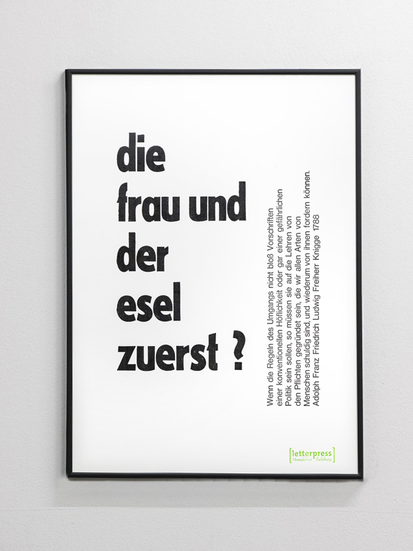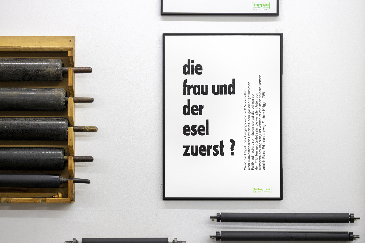 – Plakate – Auf unserer Andruckpresse entstehen diese Typo-Plakate in kleiner, nummerierter Auflage mit alten Holzlettern und Bleisatz, die oft aus dem politischen Geschehen inspiriert sind, ein aktuelles Zeitgeschehen visualisieren, eine Gedankenströmung wiederspiegeln, aber immer mit einem kleinen Augenzwinkern oder Stirnrunzeln auf das tägliche Leben um uns herum antworten. Gedruckt werden die Plakate auf dem wunderschönen Accademia 160gramm von Fedrigoni in der Größe 50x70cm.