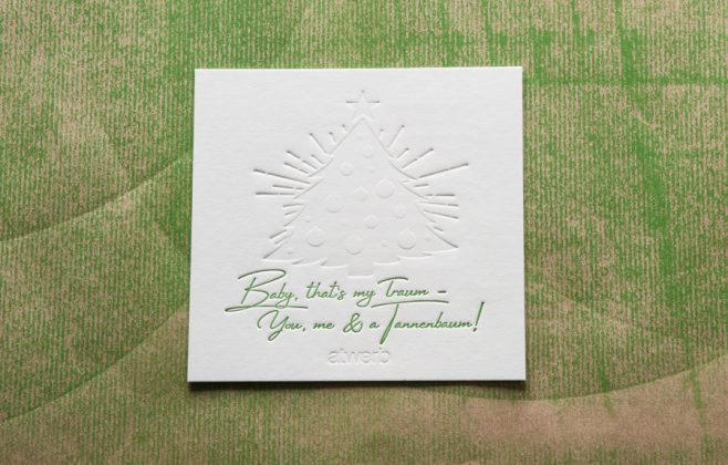 Für die Marketingagentur atwerb durften wir diese Weihnachtskarte auf dem Liberty-Fußtiegel drucken. Ein strahlender Weihnachtsbaum als Blindprägung und der Text auf Vorder- und Rückseite in einem lebendige... mehr dazu »
