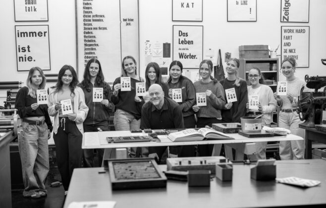 Im Team wird dann das Drucklayout erstellt, ein kreatives Miteinander. Gerne verwirklichen wir im Rahmen unseres Typoarchives natürlich Zitate oder Satzblöcke, die die Teilnehmer gerne drucken möchten.